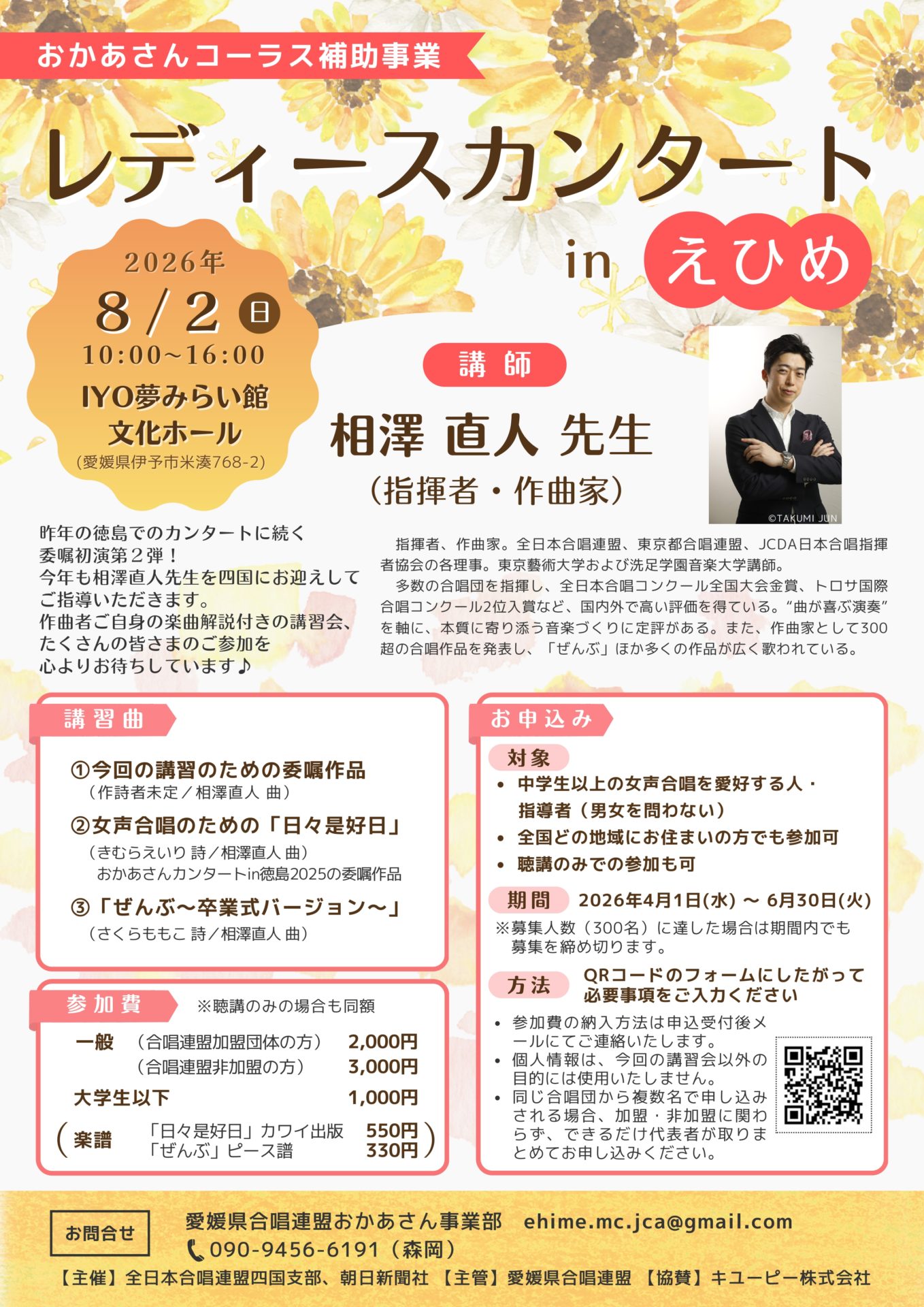 講習会2026年8月2日(日)、愛媛県伊予市のIYO夢みらい館(伊予市文化交流センター)にてレディースカンタートinえひめが開催されます。講師は相澤直人先生で、県外からも参加可能です。4月1日より申込開始です。ぜひふるってご参加ください。